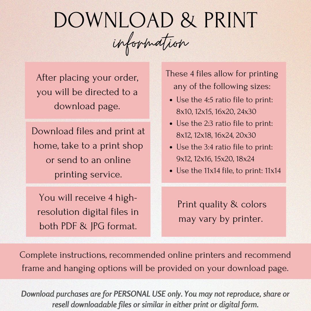 - You will receive 4 high-resolution digital files in PDF format and 4 in JPG format. Having both formats will allow you to print at most any printer.